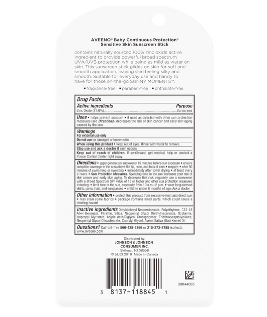 Aveeno Baby Continuous Protection Zinc Oxide Mineral Sunscreen for Sensitive Skin, Broad Spectrum SPF 50
