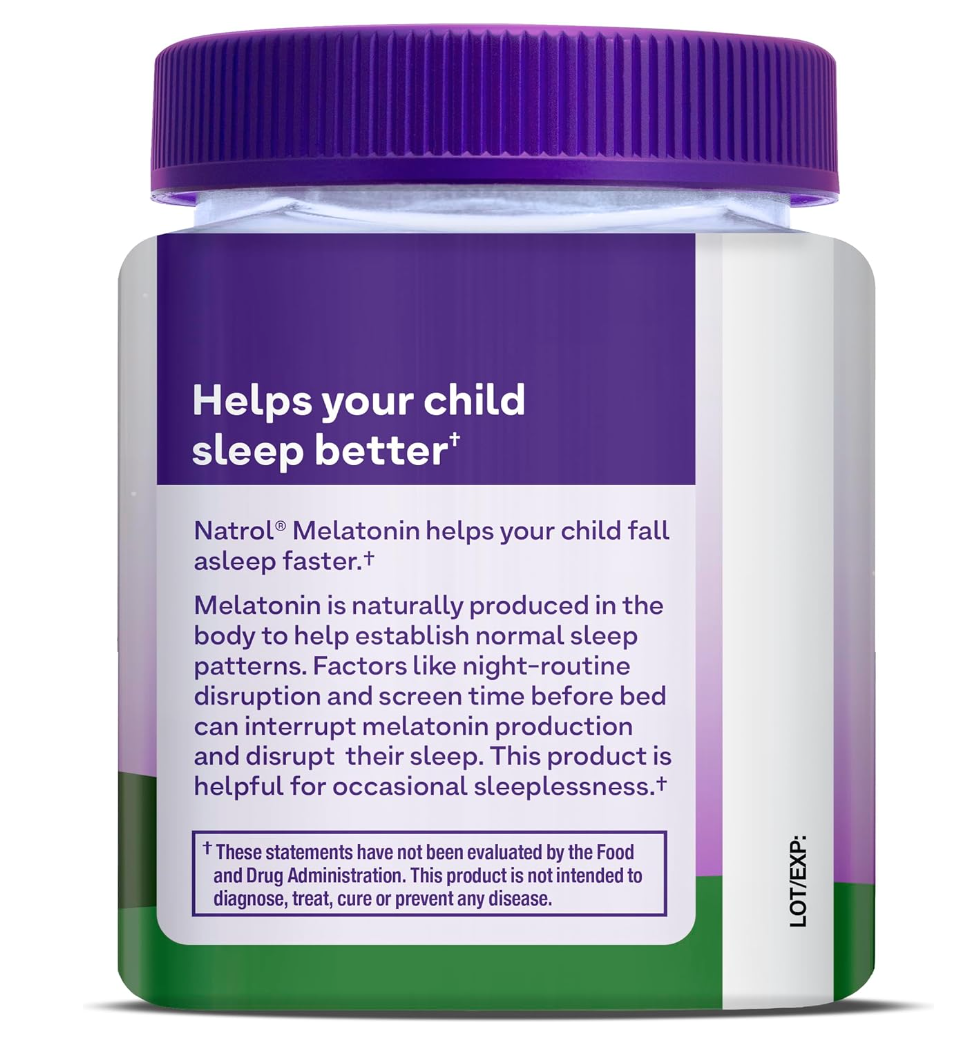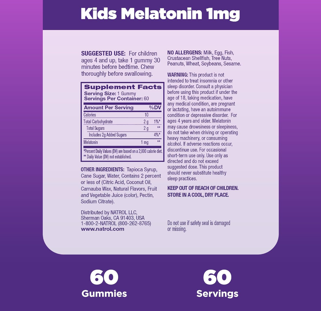 - One (1) 60 count bottle of Natrol Kids Melatonin 1 mg raspberry flavored kids sleep gummies for a 60-day supply