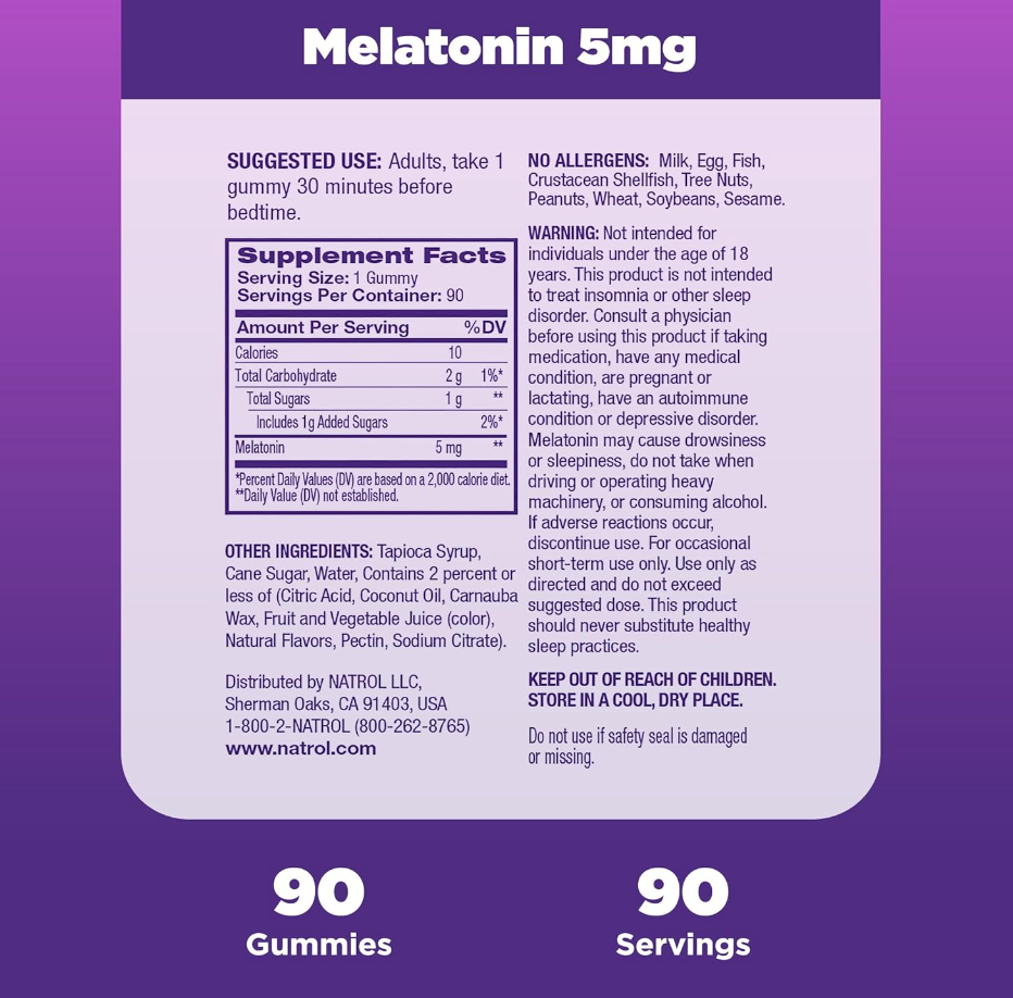 - FALL ASLEEP FASTER: Natron Melatonin 5 mg Gummies are a nighttime sleep aid. Melatonin is naturally produced by our bodies to help manage sleep cycles, but its balance can be easily disrupted. It helps you fall asleep faster, stay asleep longer, and wake up feeling refreshed. *