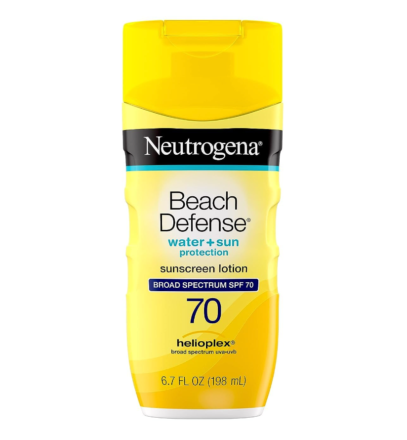 6.7-ounce bottle of Neutrogena Beach Defense Water Resistant Sunscreen Lotion with SPF 70 that helps prevent sunburn and decrease the risk of skin cancer and early skin aging caused by the sun when used as directed
