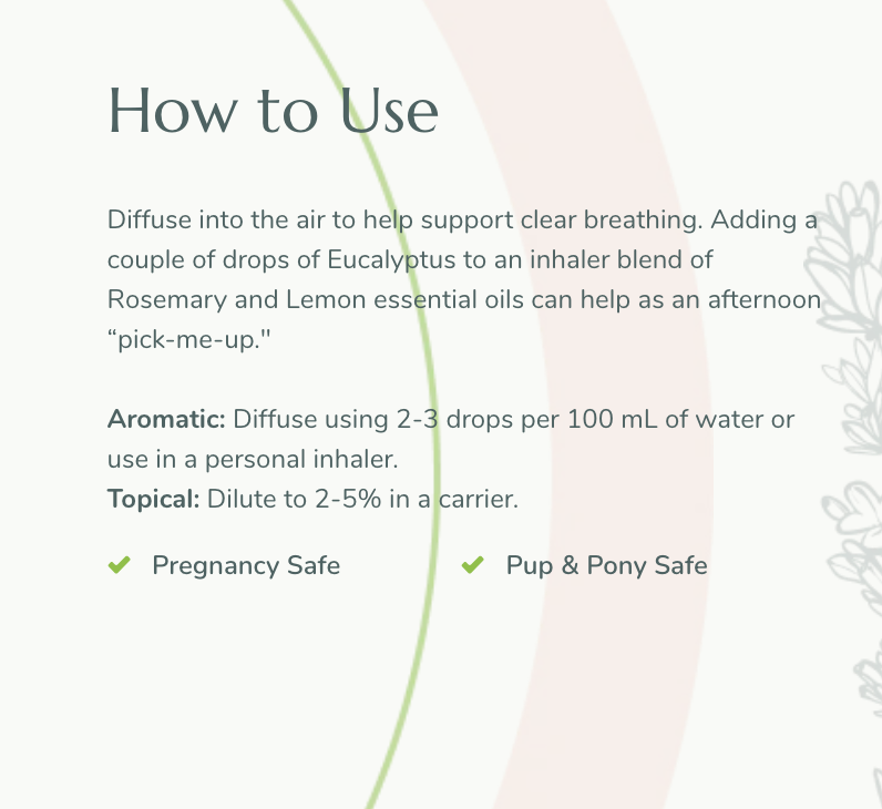 A true powerhouse essential oil, there is a reason why it’s widely known in the aromatherapy world. To help ease congestion, colds, or any other common illnesses, Eucalyptus Globulus is notably known for promoting great respiratory health. Also, when used in a massage or with other topical blends, this essential oil can help aid in muscle aches and pains caused by strenuous exercising or normal changes due to aging. If you are looking for something to help stimulate the mind and bring more mental focus into your life, Eucalyptus Globulus is a great essential oil to do so. Get ready to take in its herbaceous scent, accompanied by its soft, woody undertones.